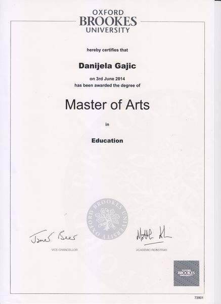 Magistar engleskog jezika na Oxford Brookes Unierzitetu, autor međunarodno predstavljene GSD metode za ubrzano učenje engleskog jezika i direktor nastave u školi Britanika. Predavač engleskog jezika od apsolutnih početnika do najviših nivoa priprema za međunarodne ispite. Obučila više od nekoliko stotina profesora za rad po GSD metodi i držala predavanja profesorima iz celog sveta na više međunarodnih konferencija IATEFL-a. Profesor engleskog za koga "nemogući slučajevi" ne postoje. makar za sada. :) Specijalizacije mr Danijele Gajić koje omogućavaju totalno skeniranje Vaših sposobnosti, poteškoća i potreba prilikom učenja engleskog jezika su u najosnovnijim crtama sledeće: -Magistarske studije na Oxford Brookes University (full time) i oblasti specijalizacije: 1. Obrazovni sistemi i obrazovne organizacije u svetu 2. Principi usvajanja engleskog jezika 3. Upotreba maternjeg jezika u nastavi engleskog jezika 4. Podučavanje engleske fonetike sa fonologijom 5. Podučavanje engleskog jezika kao drugog ili stranog jezika 6. Analiza i praksa savremenih metoda i pristupa učenju engleskog jezika 7. Jezik učionice i psihologija nastavnika 8. Podučavanje različitih kategorija i uzrasta polaznika 9. Podučavanje jako mladih polaznika (YLE) 10. Podučavanje odraslih 11. Podučavanje kratkih, ubrzanih kurseva 12. Pisanje i selekcija udžbenika 13. Engleski za posebne profesionalne svrhe (ESP) 14. Engleski za akademske svrhe (EAP) 15. Poslovni engleski jezik (Business English) 16. Metode naučnog istraživanja (Research Methods) 17. Magistarski rad, disertacija od 20.000 reči na temu: Testiranje i ocenjivanje „An Analysis of the Achieved Results in The Quick Placement Test and The Oxford Placement Test: Choosing a more practical and applicable test“ ( Analiza postignutih rezultata na brzom ulaznom testu i oksfordskom ulaznom testu: izbor praktičnijeg i primenljivijeg testa)- eksperiment sa 150 polaznika na dva testa sa statističkom i kvalitativnom analizom rezultata -Modularne oblasti u toku magistarskih studija na Oxford Brookes-u: • Usvajanje jezika: Principi i praksa • Podučavanje jezika: Metode i pristupi • Opisi engleskog jezika: Jezik u učionici • Engleski za jako mlade učenike: Rani i predškolski uzrasti • Engleski za posebne svrhe: Akademski i strukovni kursevi • Naučno istraživanje i metode naučnog istraživanja • Magistarska disertacija: Oblast testiranja i ocenjivanja znanja, praktični eksperiment Stečeno priznanje: MA in Education, Oxford Brookes University, MA TESOL-Teaching English as a Second Language -Stručni seminari i dodatno obrazovanje: Pored magistarskih studija na Oksfordu, mr Danijela Gajić je stekla dodatno specijalističko znanje na najstručnijim međunarodnim seminarima za profesore engleskog jezika kroz matičnu strukovnu organizaciju IATEFL. Preko 900 sati raznih strukovnih seminara od 2007. do 2009. godine odslušanih pre svega u Velikoj Britaniji kod najvećih imena savremenog engleskog jezika. Nakon tri godine usavršavanja, 20 godina iskustva i rada,10 godina rada škole Britanika, nakon potvrde GSD metode za učenje engleskog jezika u inostranstvu pred strukovnim organizacijama profesora engleskog jezika širom sveta, prof. Danijela Gajić je upravo na preporuku više stranih kolega iz IATEFL organizacije sa sigurnošću i glatko upisala pune magistarske studije na Oxford Brookes univerzitetu 2009.godine. -Ovo su najbitnije međunarodne konferencije i odslušani seminari: • Velika Britanija, Aberdeen: 41st International Annual IATEFL Conference, 18-22 April, 2007; Odslušala predavanja lično kod sledećih svetskih stručnjaka: - Martin Hewings (Advanced English Pronunciation- Izgovor na napednom nivou) - Zeynep Urkun (Međunarodni akademski ispiti- stručna debata iskusnih profesora o EAP- motivacija i ostali bitni faktori uspeha) - Peta Eisberg (Mobile Language Village- Engleski putem mobilnog telefona) - Adrian Underhill (Profesori kao menadžeri privatnih škola) - Elaine C. Gilmore (BULATS- sve o testiranju biznis engleskog) - Guy Cook (Using translation in ELT- upotreba prevoda na maternji jezik) - Sarah Mercer (Symposium on language learner psycology- simpozijum o psihologiji polaznika) - Diane Malcolm (Academic reading in Medical school- Akademsko čitanje u medicinskim školama) - Sheila Thorn (An exploration of listening practice- Istraživanje prakse slušanja) - Mark Fletcher (Brain-friendly learning and teaching- Učenje i predavanje prijemčivo za naš mozak) - Ruth Breeze (Symposium on Academic Writing- Simpozijum o akademskom pisanju) - John Rodgers (Skimming through IELTS- Pregled IELTS ispita) - Susan Barduhn (Symposium on CLIL – simpozijum o podučavanju dece CLIL metodom) - Miroslaw Pavlak (Acquisition of the Present Perfect Tense- Kako savladati nemogući nesvršeni perfekat u engleskom jeziku) - Wayne Rimmer (Symposium on storytelling- simpozijum o upotrebi pripovedanja priča i anegdota na času kao modela govora za polaznike) - Helen Spencer-Oatey (Symposium on Chinese Learners- simpozijum o podučavanju polaznika iz Kine) - Mike Sharwood Smith (plenarno predavanje: You can take a horse to water, but you cannot make it drink- Možeš konja dovesti do vode, ali ga ne možeš naterati da pije- kako motivisati polaznike koji ne vole jezike ili ih uče na silu) - Peter Grundy (ELT and why we need a new pragmatics- Podučavanje engleskog i zašto nam trebaju novi pristupi) - Spiros Papageorgiou (Standard setting methodology in language testing: theory and practice-Metodologija uspostavljanja standarda u testiranju jezika: teorija i praksa) - Shih-Chieh Chien (L1 use in L2 writing- Upotreba maternjeg jezika u pisanju na engleskom jeziku) - Teadira Perez (Online learner discussion groups- Onlajn grupe polaznika za diskusije) - Tim and Zoe Graham (Error correction- Kako i kada ispravljati polaznika) - Justin Kernot (Interactive whiteboards- Upotreba interaktivnih belih tabli- Iskustva, mitov