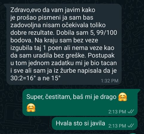 Po struci sam master inženjer elektrotehnike i računarstva. Držim online privatne časove iz matematike za osnovce i srednjoškolce i časove iz fizike za osnovce. Iza sebe imam na stotine zadovoljnih učenika, kako osnovaca i srednjoškolaca tako i sada već studenata. Držim i pripremnu nastavu za prijemni ispit iz matematike za srednje škole (u to uključujući i računarsku gimnaziju) i fakultete, individualno i grupno, u zavisnosti od toga za šta su učenici više zainteresovani. Cena se kreće od 2000 do 2500 dinara za čas od 90 minuta, u zavisnosti od tipa gradiva (osnovna skola/srednja skola/priprema za prijemni) uz mogucnost formiranja paketa sa korigovanom cenom za buduće stalne učenike. Časovi se odvijaju preko aplikacije zoom, nakon čega učenik dobija pdf fajl sa materijalom koji je predjen za vreme časa i domaćim zadatkom, u kome su posebno označene sve bitne stvari kao i materijal sa teorijom vezanom za obradjenu oblast. Materijal se može odštampati i koristiti kao skripta. Dostupna sam za sva eventualna pitanja nakon časa, ukoliko je nešto ostalo nejasno, kao i pitanja vezana za zadati domaći zadatak. Stalni učenici koji kod mene spremaju prijemni ispit za fakultet, takodje dobijaju priručnik sa izvučenim svim formulama koje su potrebne za pripremu zadataka, kako bi im sve bilo pregledno i na jednom mestu prilikom vežbanja. Za više informacija kontaktirajte me preko poruke ovde, na ostavljen broj telefona ili na mejl marijamiljkovic17@gmail.com.